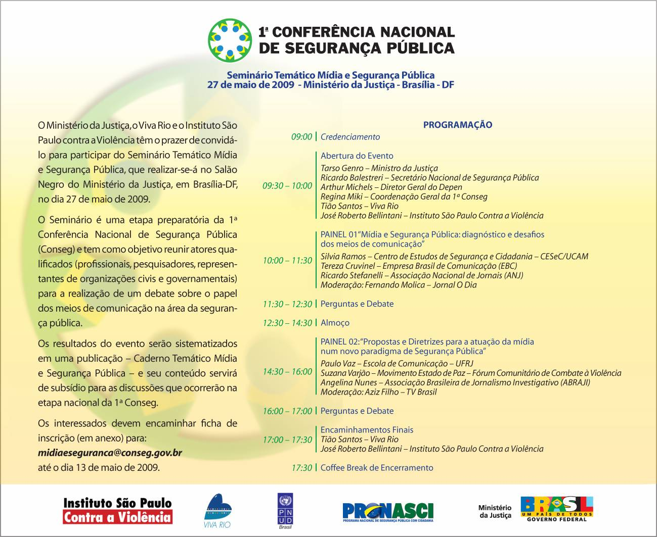 O Ministério da Justiça, O Viva Rio e o Instituto São Paulo contra a Violência têm o prazer de convidá-lo para o Seminário Temático Mídia e Segurança Pública. Abaixo segue o convite e a programação do evento. Pedimos que o divulgue, por favor. Pedimos que encaminhe a ficha em anexo preenchida para midiaeseguranca@ conseg.gov. br. Agradecemos antecipadamente e estamos à disposição em caso de dúvidas. Atenciosamente, Coordenação Executiva da 1ª Conferência Nacional de Segurança Pública – CONSEG |